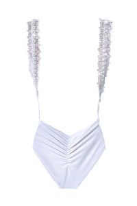 WHITE PEARL STRAP BACKLESS RUCHE BUM SWIMSUIT- Regular price