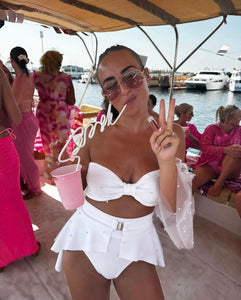 WHITE PEARL STRAP BACKLESS RUCHE BUM SWIMSUIT- Regular price